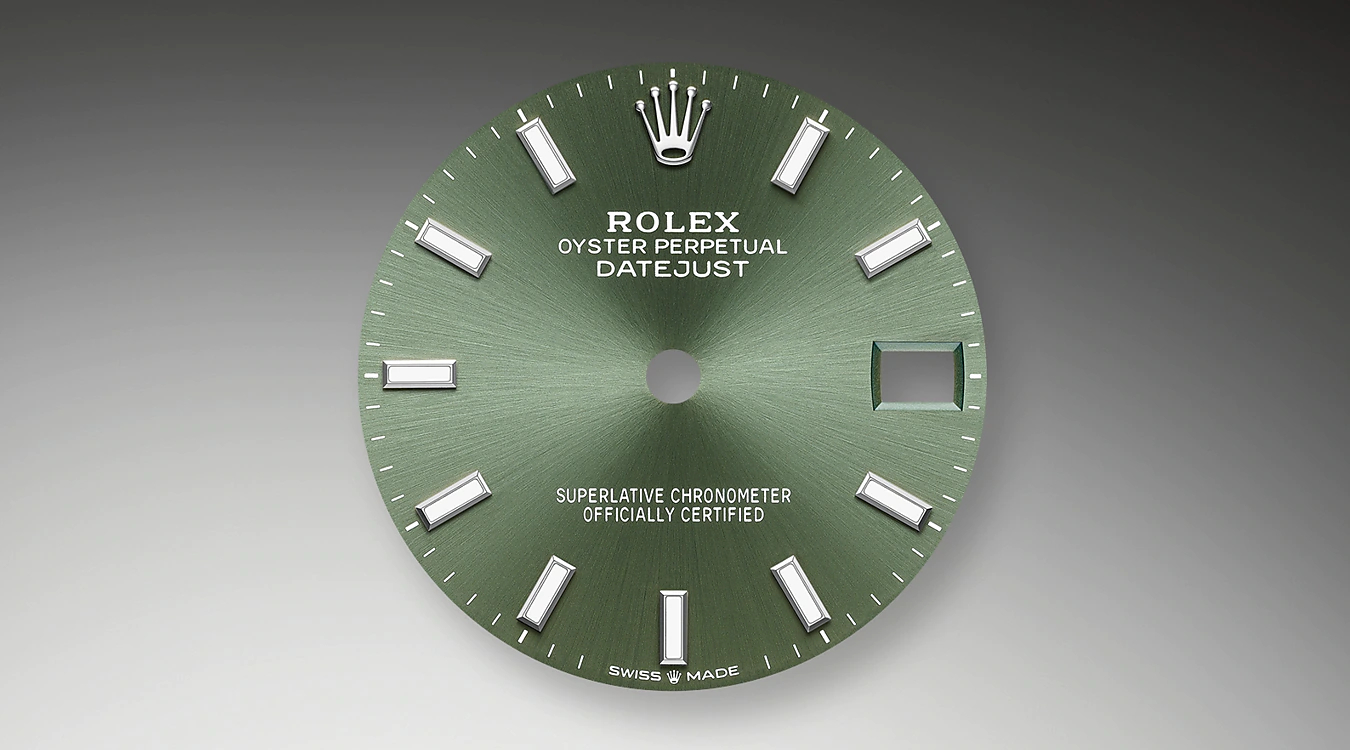 サンレイ仕上げは オイスター パーペチュアルコレクションの多くのダイアルに繊細な光の反射をもたらす。これはダイアルの中心から外側に向かって溝を作る 熟練のブラッシング技術によるものだ。光はそれぞれの彫りに沿って均一に拡散され 手首の位置に応じてわずかに動く 特徴的な輝きを生み出す。