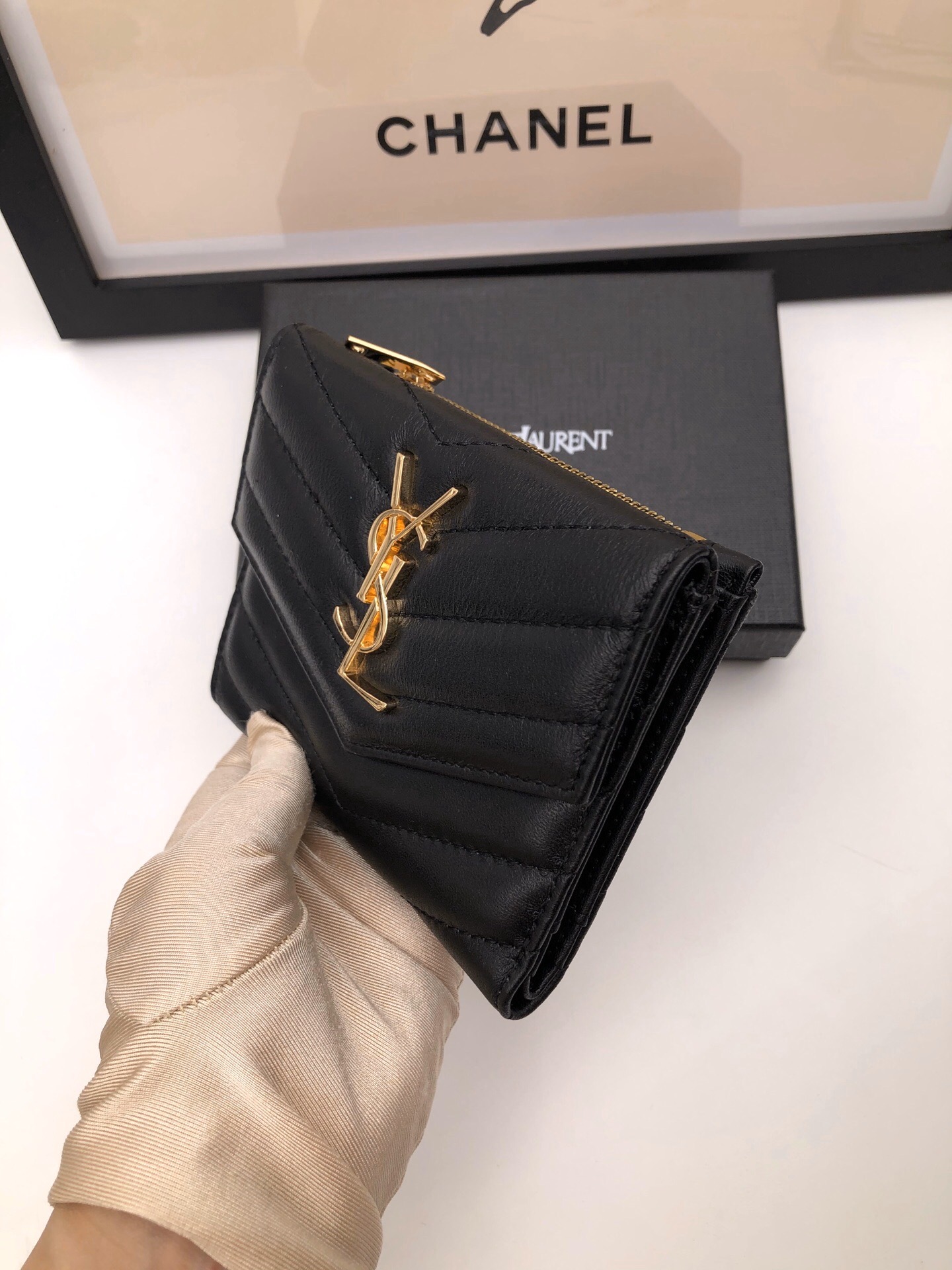 メタルフリータンニンレザーを使用したサンローラン ウォレット。メタルの連結YSLイニシャル、キルティングのオーバーステッチが特徴です。
