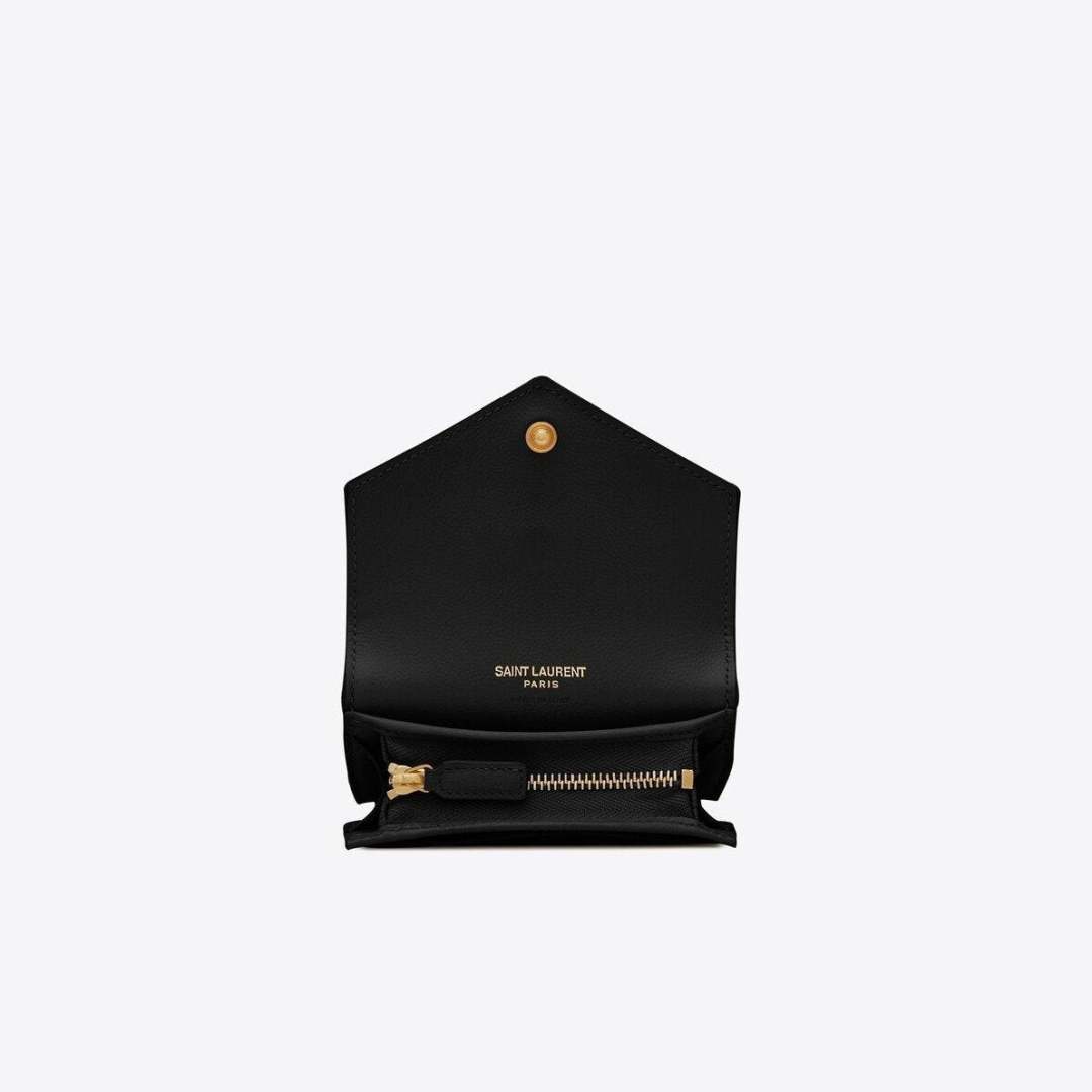 モノグラムカードケース、フロントフラップ付き、メタルYSL文字ロゴ、縦柄、V柄、四角いミックスキルティングオーバーロックで装飾。